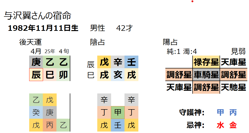 現在の大運は、3旬の甲寅にあたります。日干支 戊戌が七殺にあっている状態です。本来良い大運とは言えません。与沢翼さんは持ち前の能力を発揮して、この大運も戦ってこられたことが伺えます。