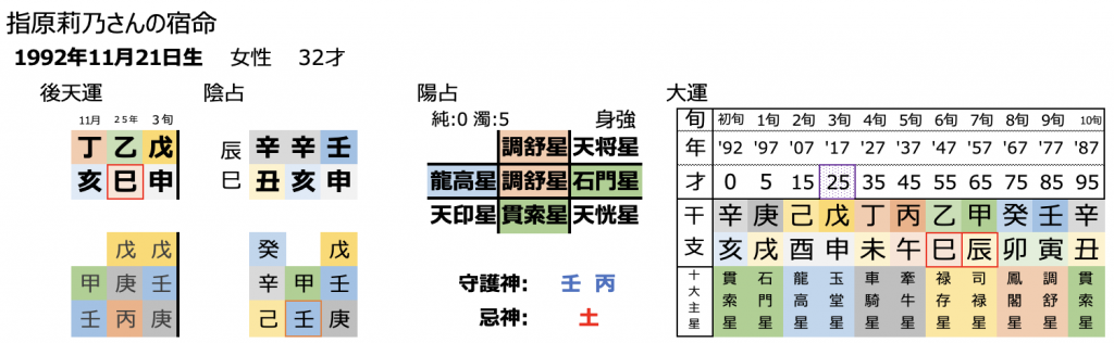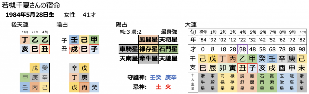 まず若槻さんの第三命星は、石門星です。40歳代なので中年期ですが、初年きも大きな影響を与えますし、人物で見ると同年代、同僚を指します。指原さんは、後輩ではあるものの友人として付き合っているでしょうから、まさにこの星が表面に出てきます。石門星は、協調の星です。上手く、角が立たないように、しかし、しっかり自分の言いたいことを伝えることに長けています。