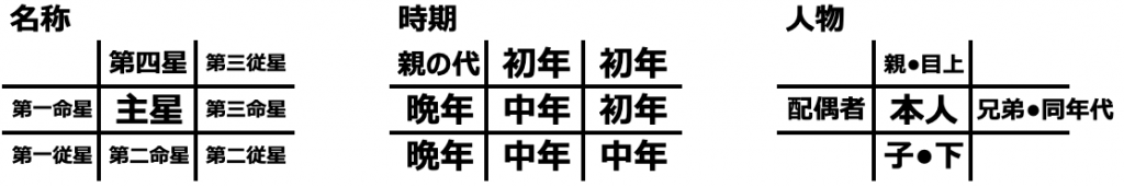 人体図の各星の名称は、下図のとおりです。またレイアウトから、星の特性が現れやすい時期や人物がそれぞれの割り当てられています。